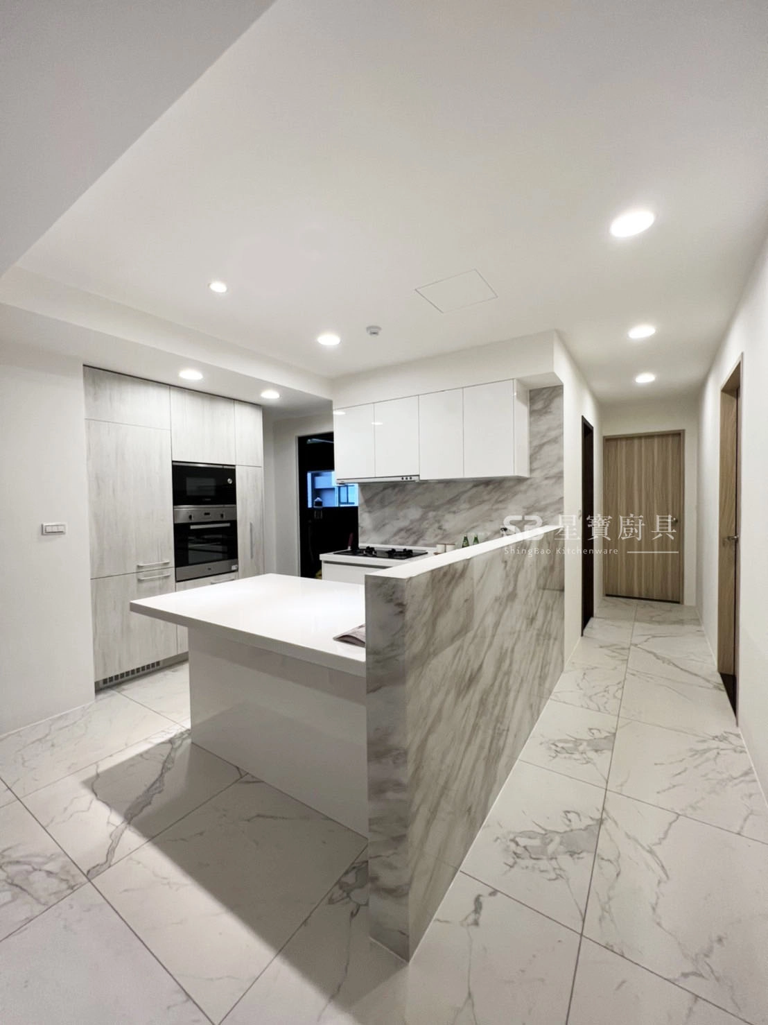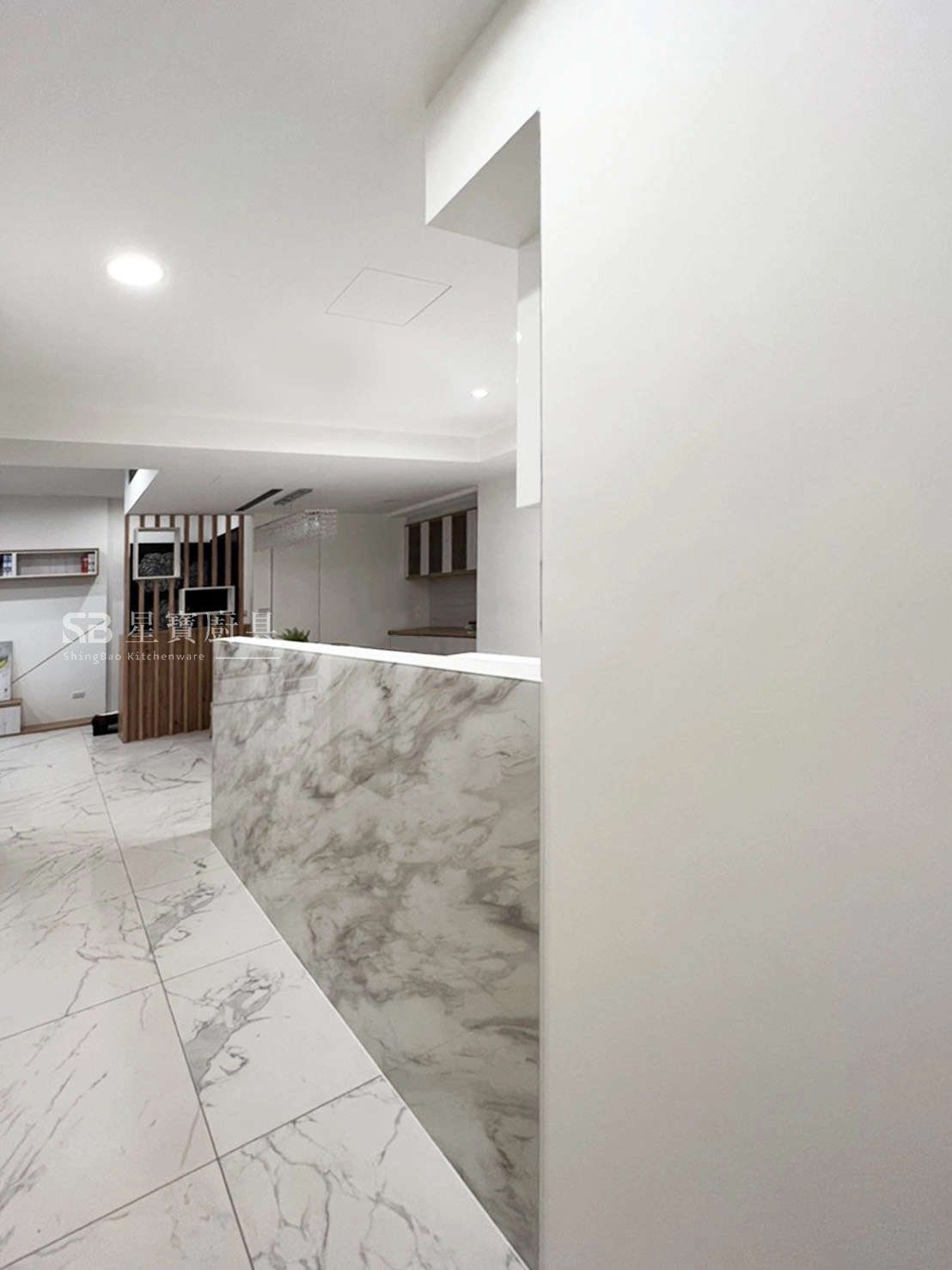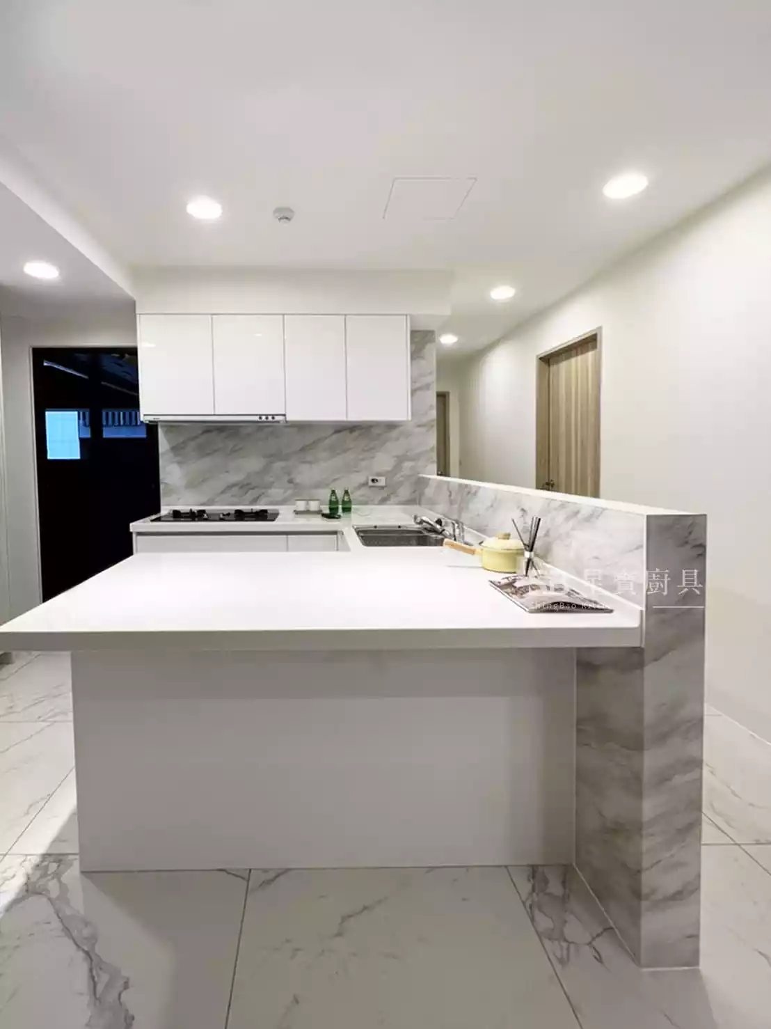 檯面材質|韓國LG人造石 / G234 *樣式選擇多、無接縫好清潔、耐用性高、易護理。櫥櫃門板|盛東 / 結晶烤漆-亮白 / AE-110 荷花白 *近似鋼琴烤漆的質感,底材為木心板,在底材上噴漆後黏貼的是透心的有色壓克力,色調較水晶溫潤飽滿,經過特殊製程,以達無接縫效果。